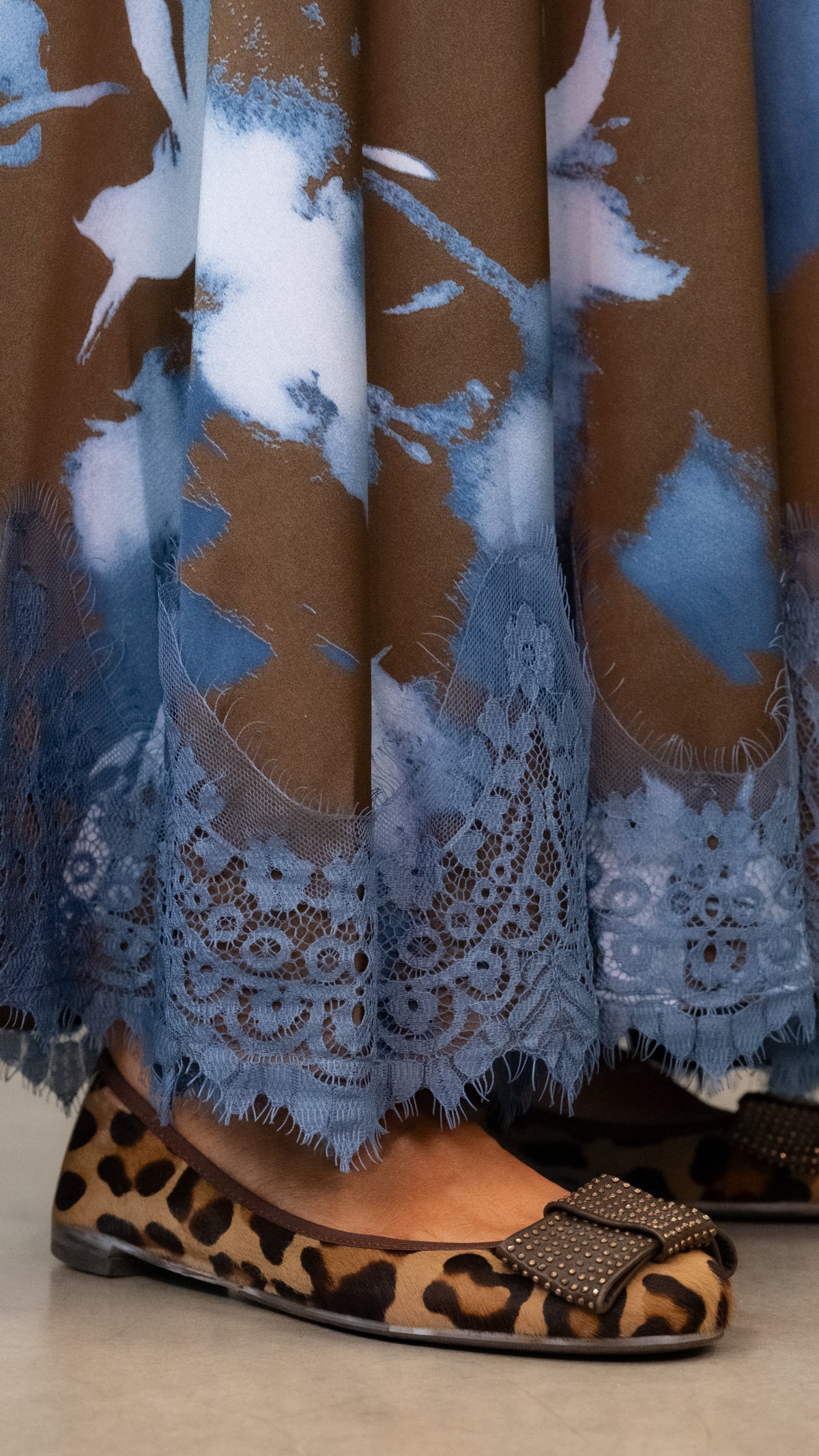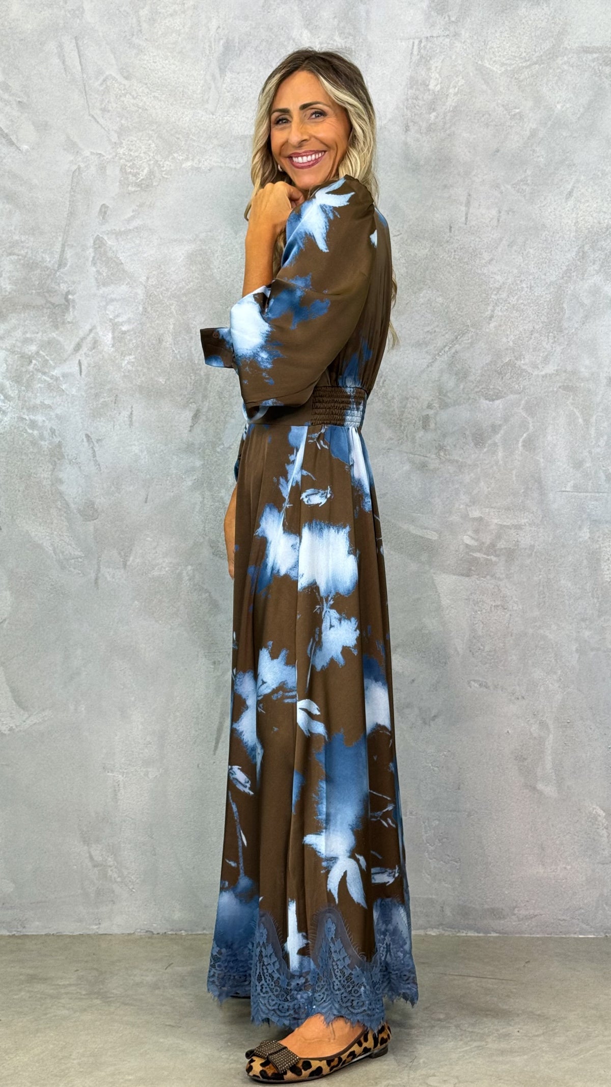 Abito a fantasia con lo scollo a “V”, con elastico nella parte posteriore. I toni dell’azzurro e del cioccolato si fondono come per incanto e il meraviglioso pizzo, che rifinisce tutto il fondo dell’abito, dona un “allure” senza tempo.