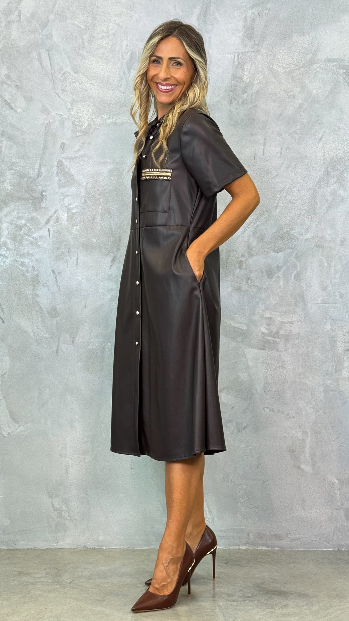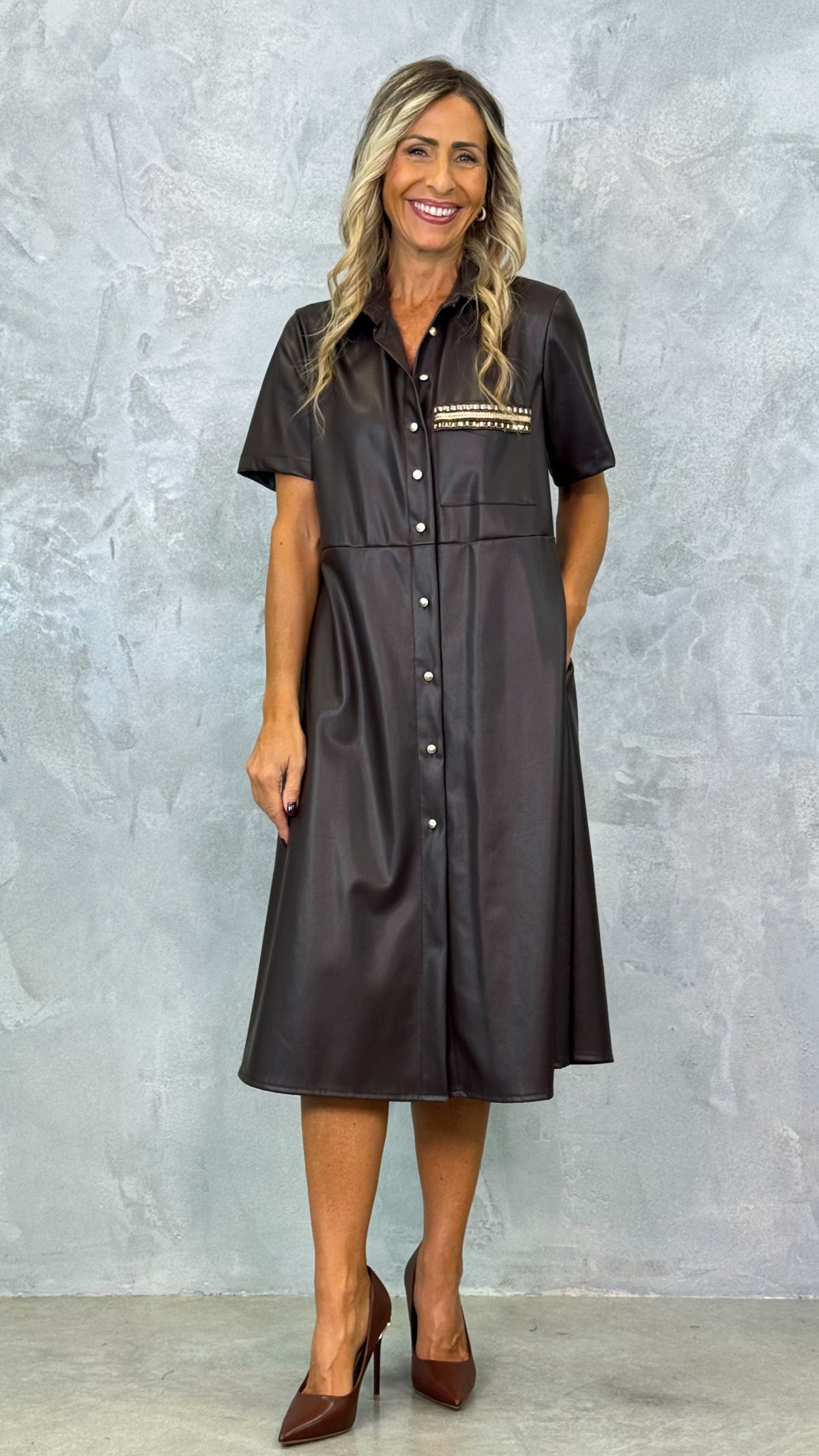 Chemisier in ecopelle a mezzamanica elasticizzato, dalla linea dritta ed elegante, con un dettaglio di passamaneria sul taschino che lo rende unico e stiloso. Perfetto per essere chic da mattina a sera