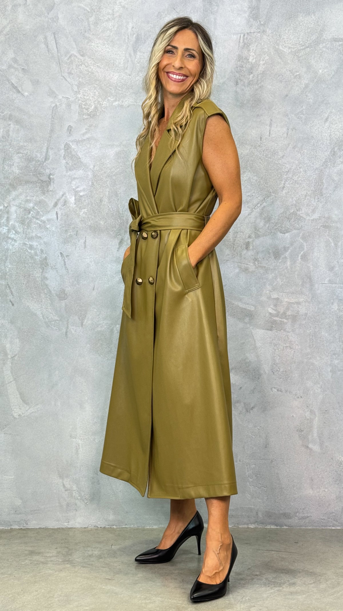 Scamiciato doppiopetto in ecopelle con cinta nei due colori grintosi di tendenza: verde oliva e nero. Perfetto e femminile abbinato con una delle camicie della nuova collezione AI 25/26