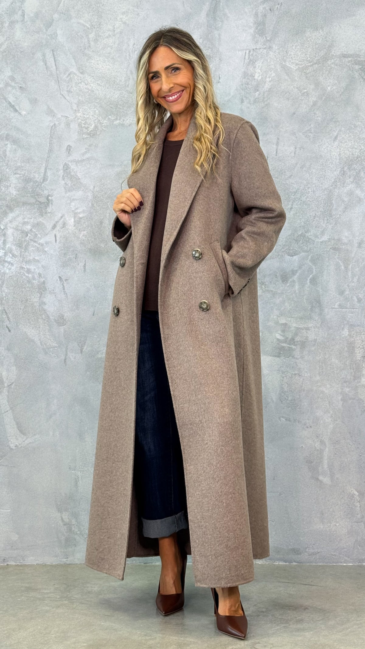 Cappotto lungo doppiopetto con cinta, in misto lana, morbido e confortevole, chic, di grande tendenza nella collezione AI 25/26. Questo raffinatissimo colore è perfetto da abbinare sia con i toni del cioccolato che del nero.