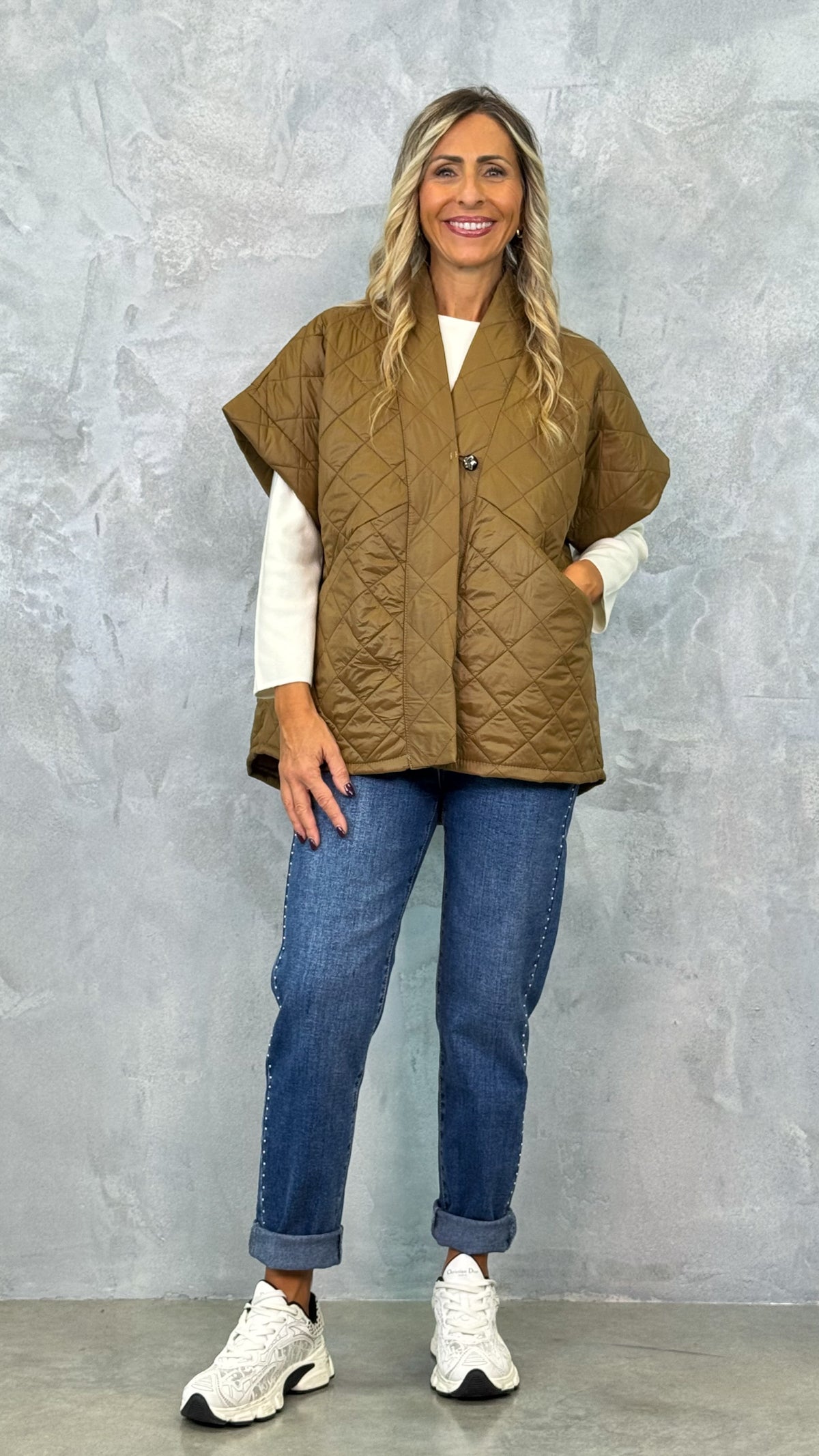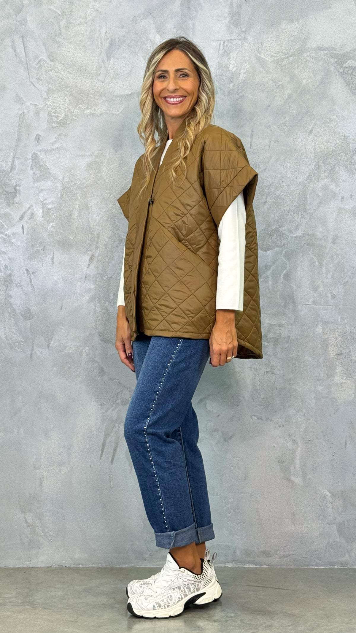 Trapuntina con tasche e maniche a ¾ con bottone gioiello uno diverso dall’altro, grintosa, comoda, chic nei tre diversi colori: nero, blu, caramello. Un passe-partout a cui non potrai rinunciare.