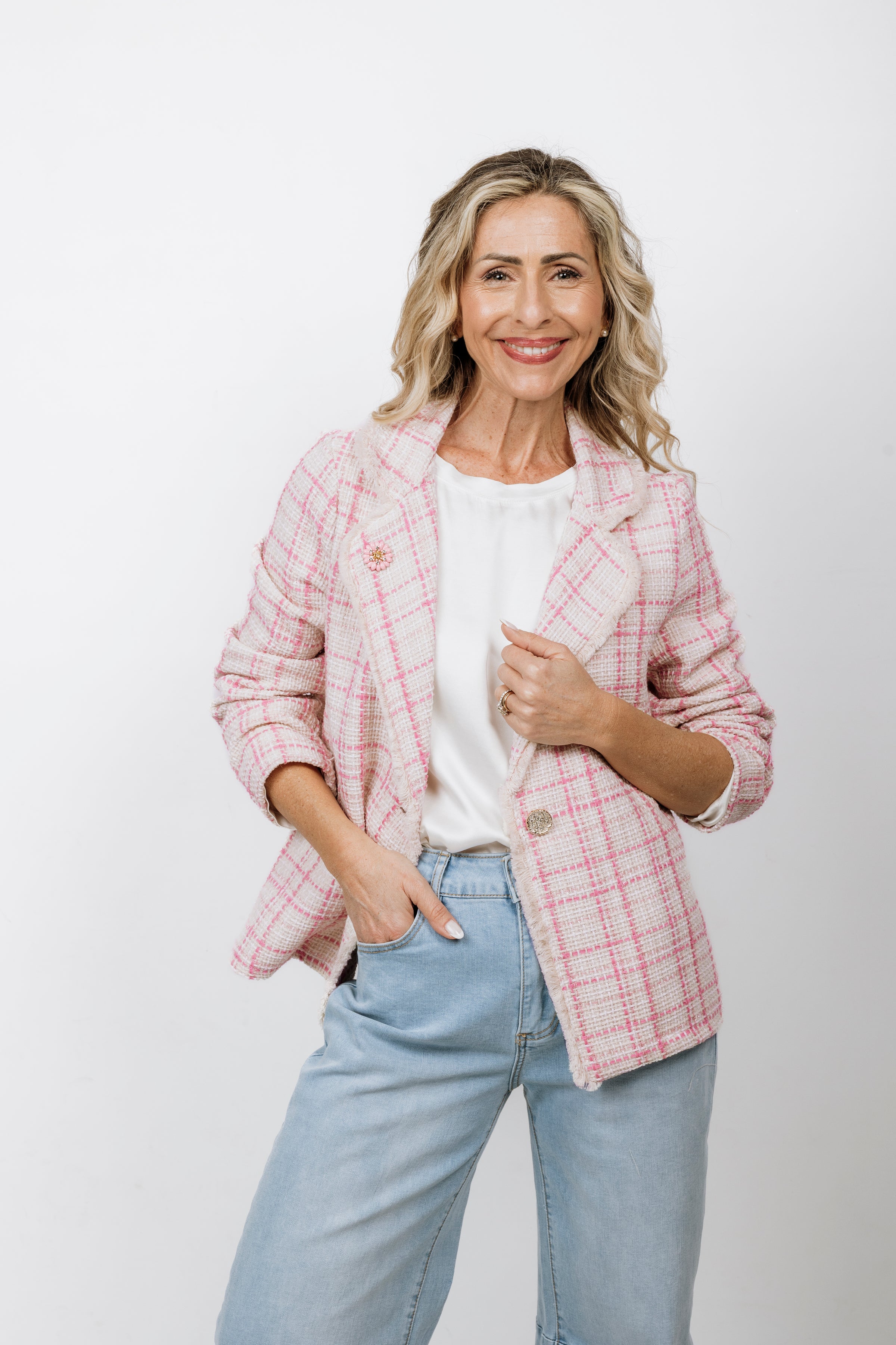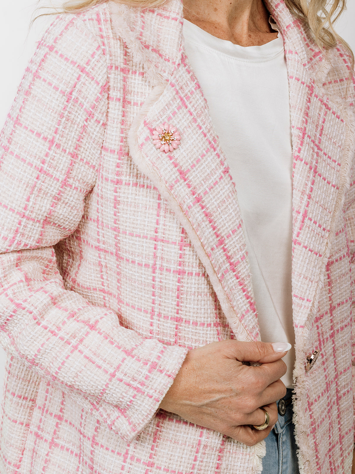 Blazer a quadri “effetto” tweed in cotone, con bottone gioiello e rever del collo tutto rifinito con micro-frange in nuance e un coloratissimo fiore in resina abbinato. Semplicemente chic con quel tocco di allure in più.