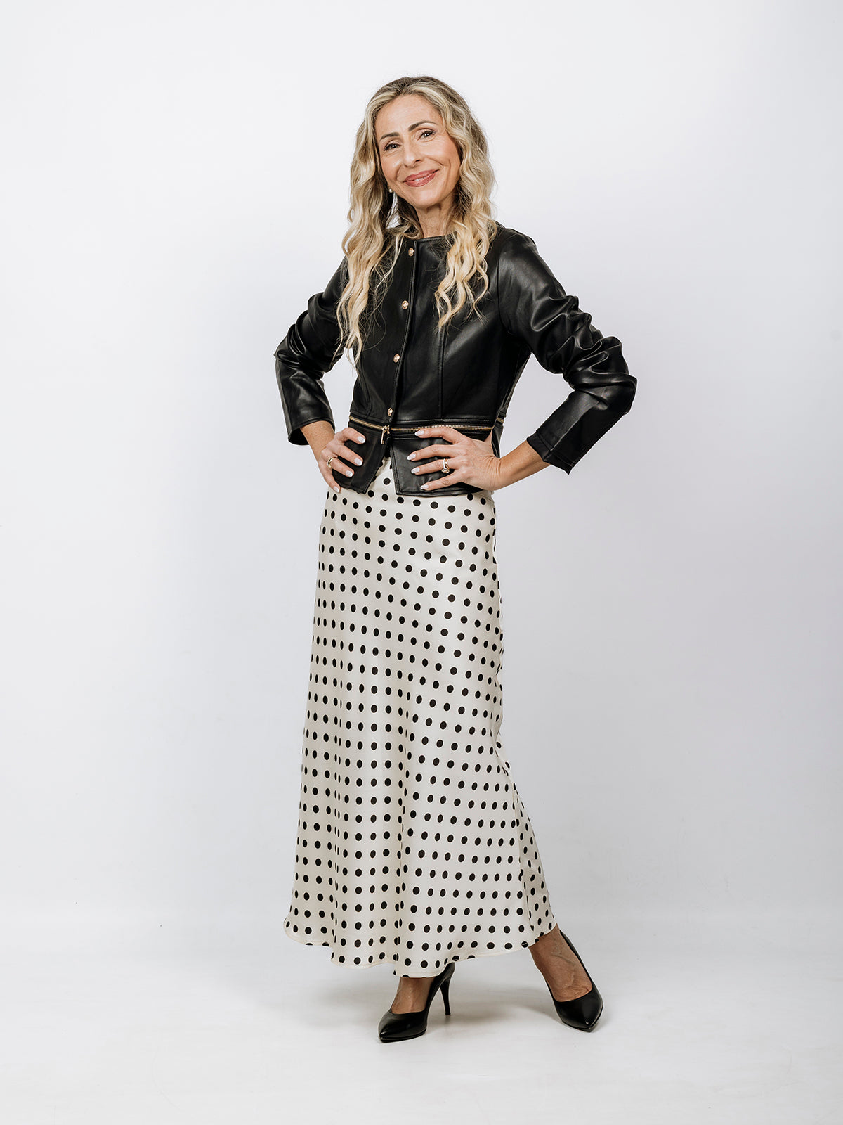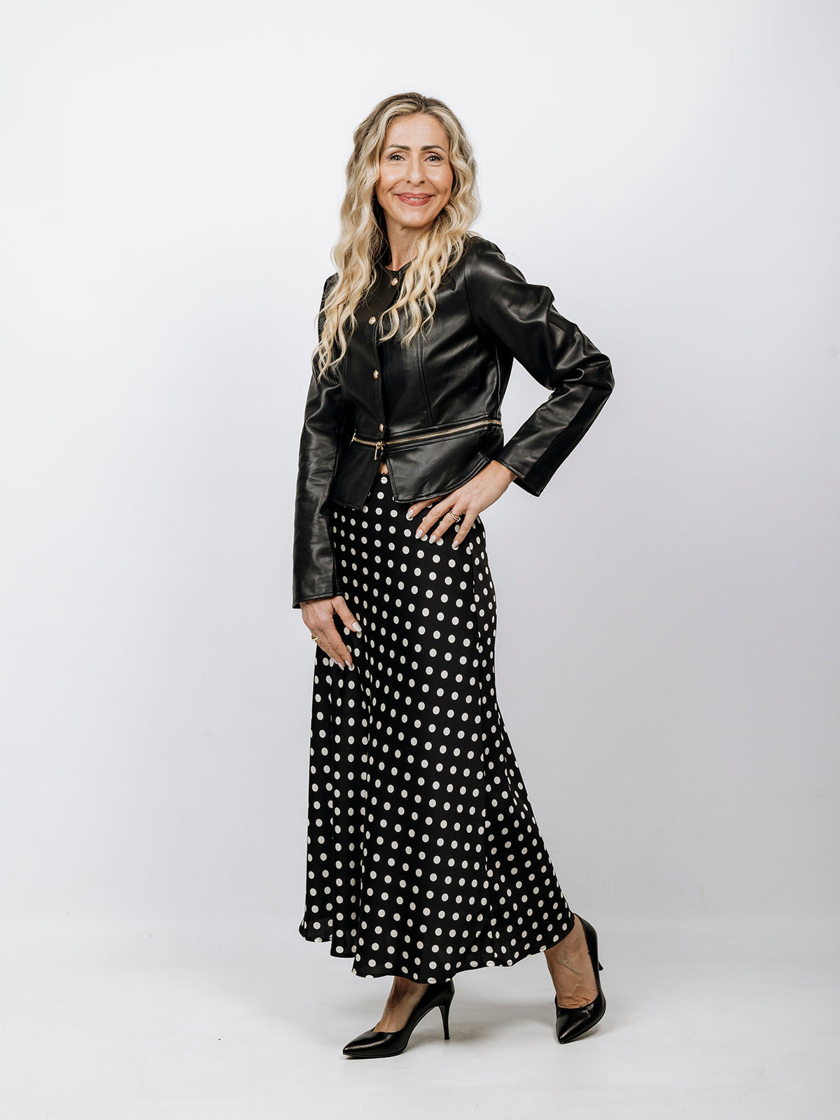 Giacca corta in ecopelle nera con bottoni e zip che la rifinisce lungo la vita. Elegante e perfetta abbinata alla gonna a pois nera e vaniglia.
