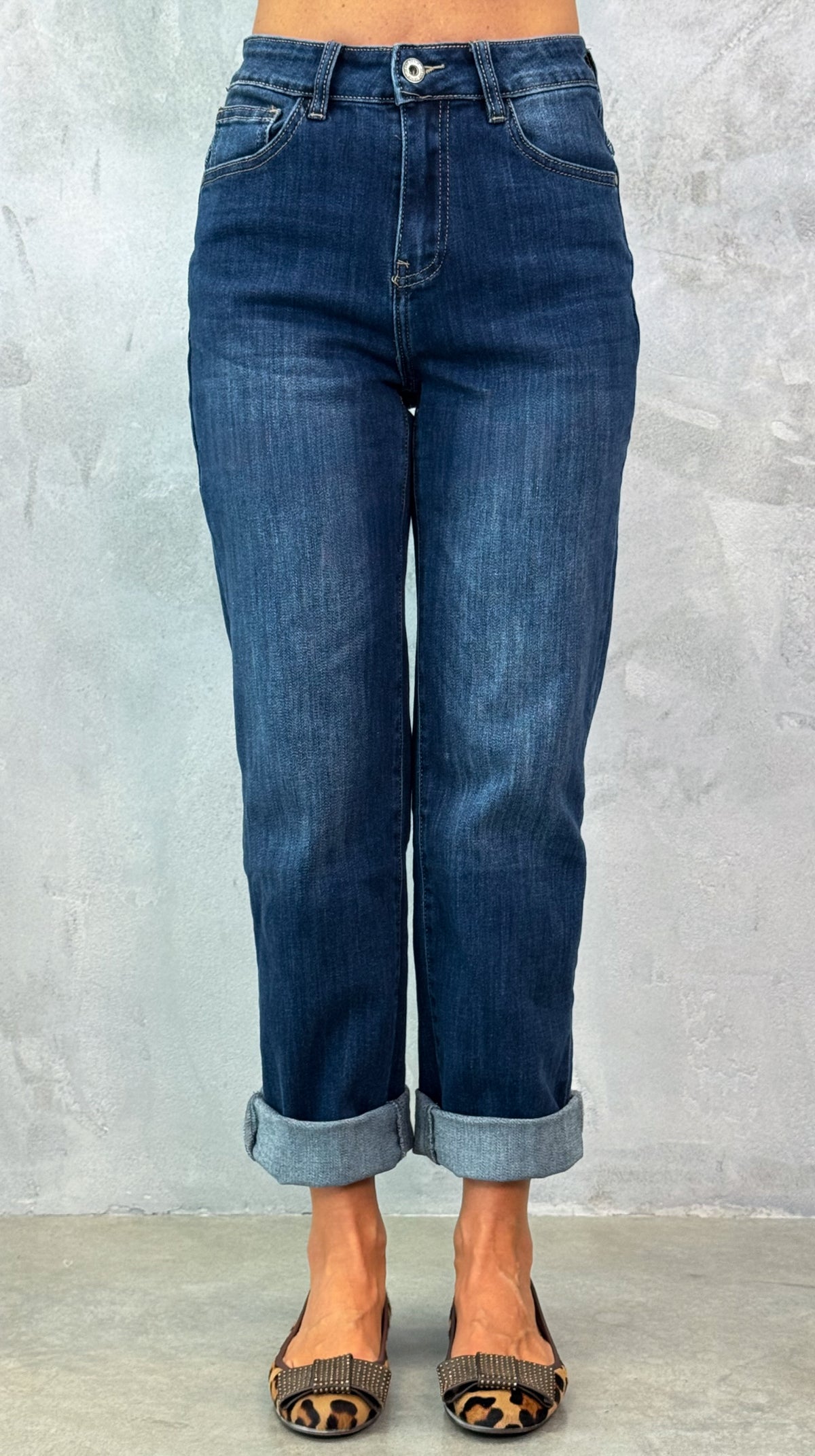 Jeans gamba dritta, elasticizzato, push-up e a vita alta, semplicemente un meraviglioso “Denim a sigaretta” nel nuovissimo lavaggio dark blue.