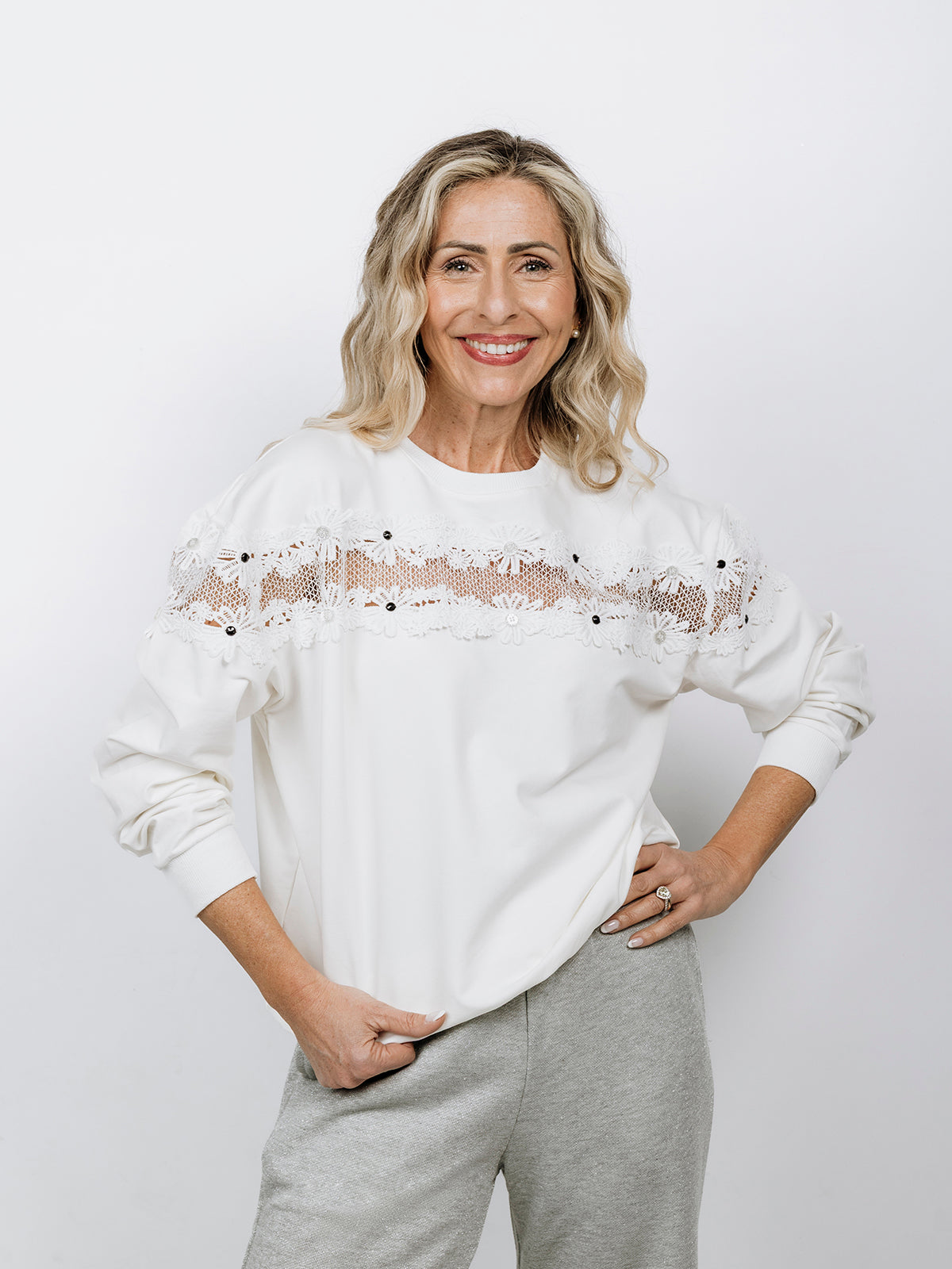 “Nuovissima chicca” per la Sottotetto Spring. Il completo di cotone con maglia traforata in pizzo con micro-gemme e pantalone palazzo con leggerissimo lurex ed elastico in vita. Pronta per essere comoda con stile!