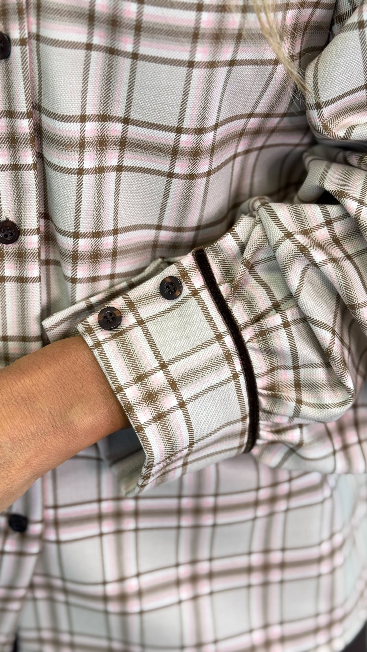 Camicia check con fiocco, morbida nel fit, dai colori del burro, cioccolato e rosa. Dettagli in micro-velluto che rifiniscono il polsino in perfetta nuance con i bottoni.