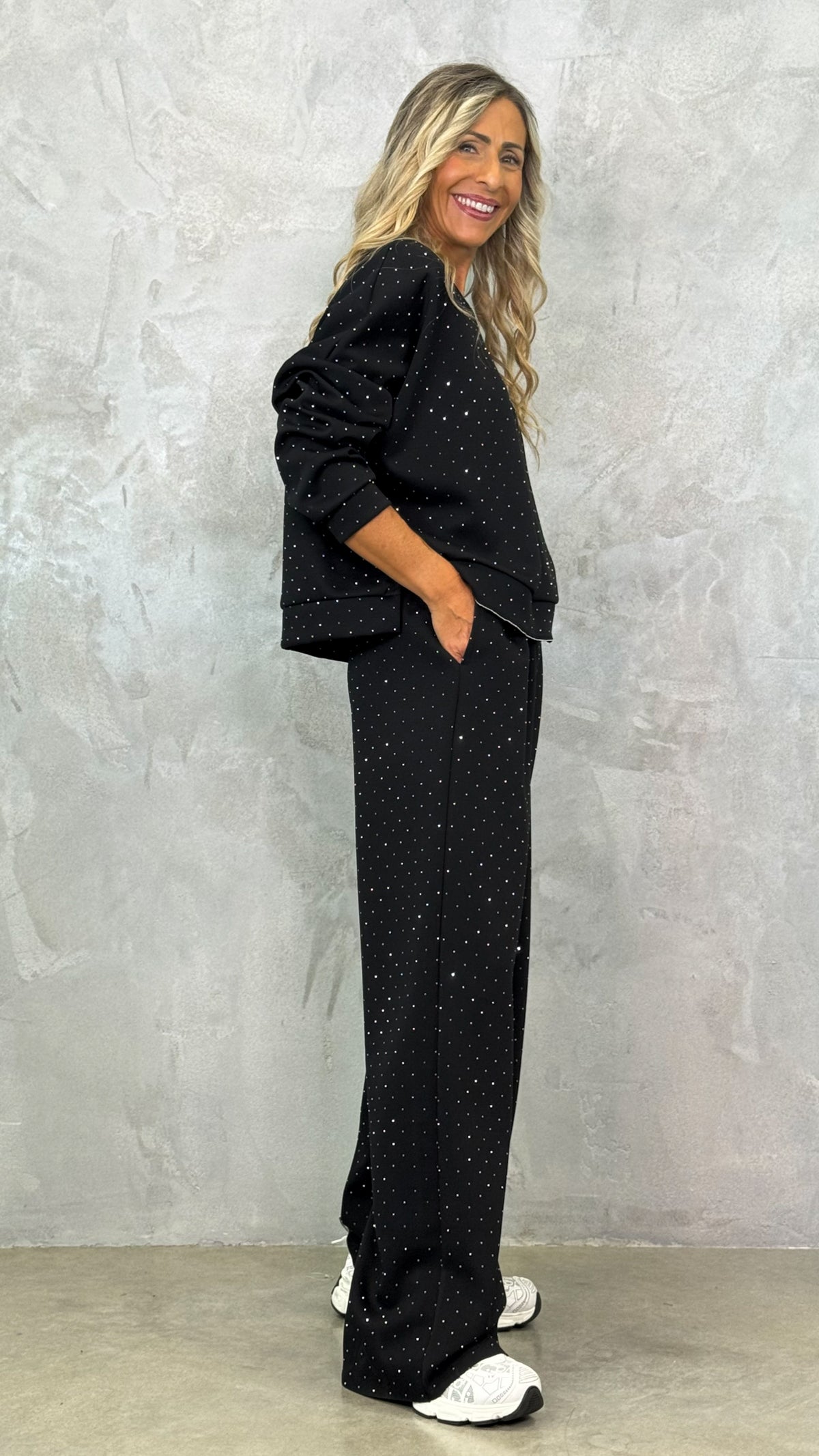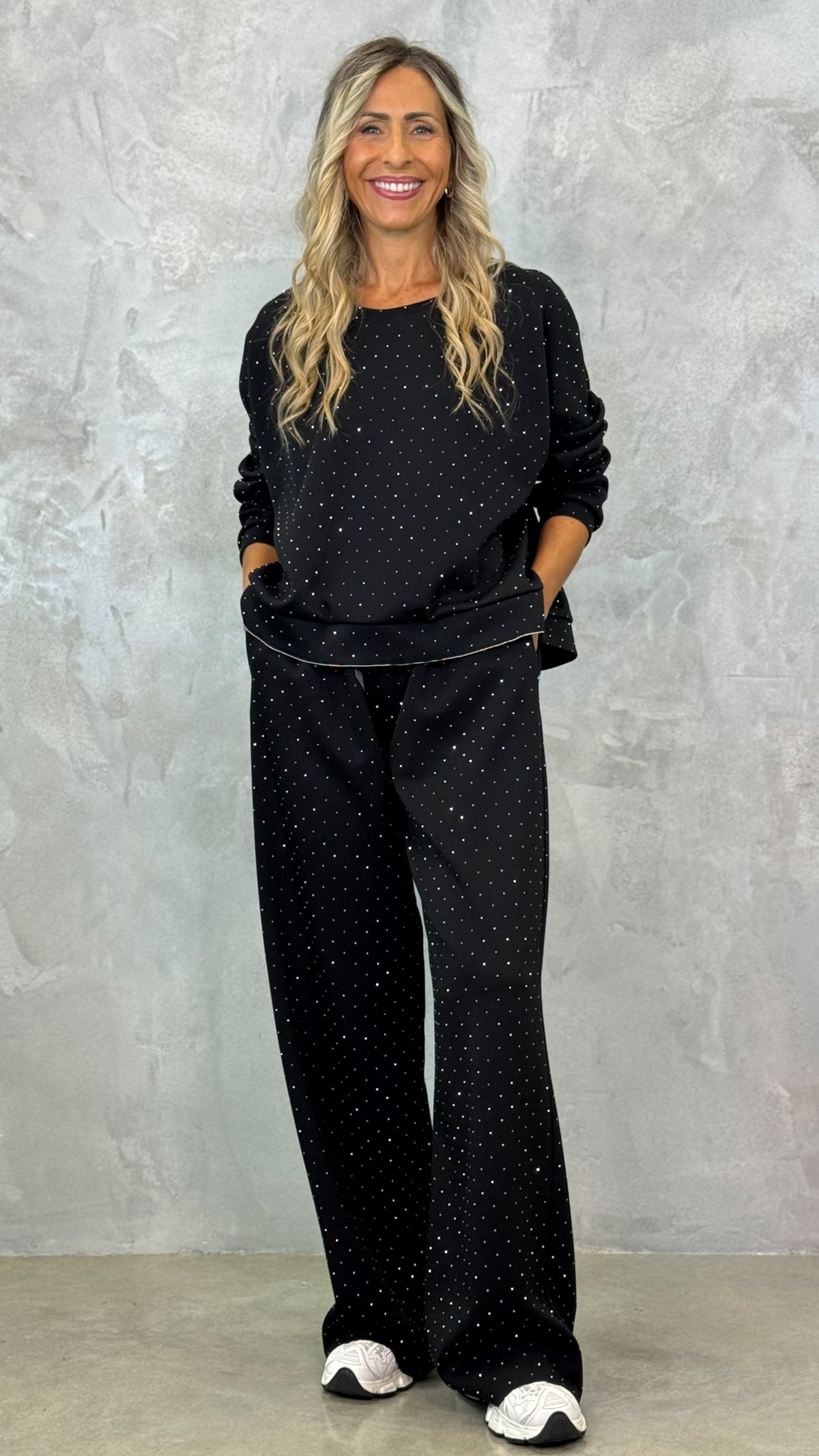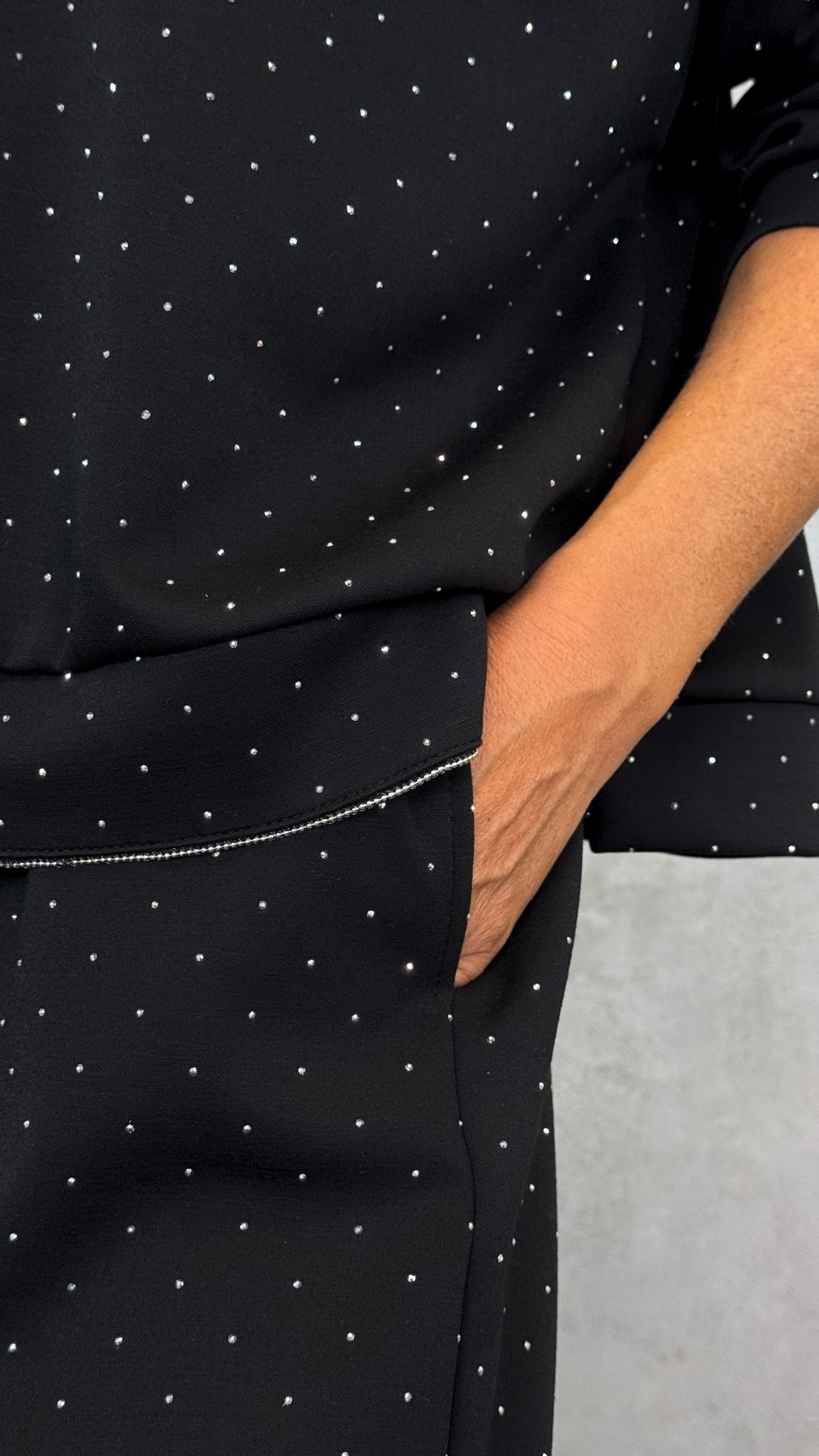 Completo in Scuba Ultra Light nero, questo anno nella nuovissima versione con Swarovski e passamaneria di micro borchiette a rifinire la maglia. Comodo, versatile e decisamente chic, non perdere il nuovo “best seller” di stagione.