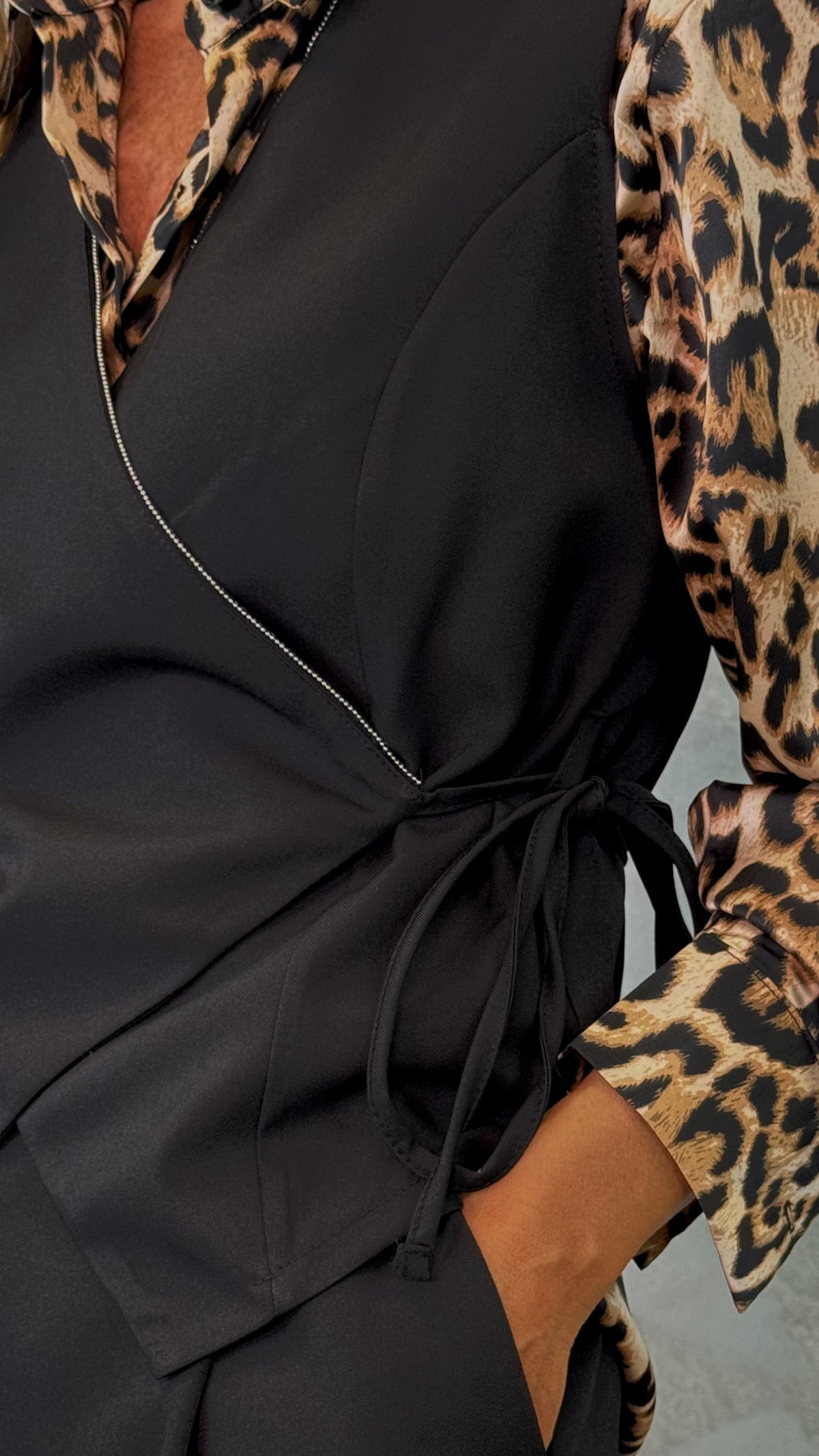 Completo con gilet corto color nero. Nuovissima tendenza in questa stagione il gilet rifinito di microborchiette, che diventa il protagonista, perfetto abbinato al suo pantalone.