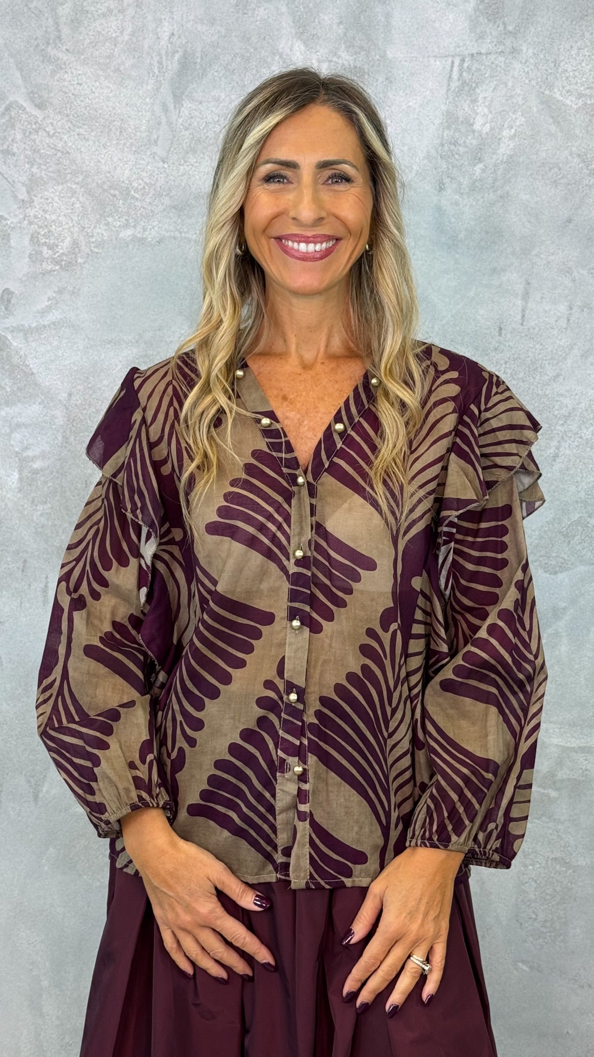 Camicia a fantasia dai toni del bordeaux e cammello, con bottoncini oro opaco. Fit morbido, non sagomato, senza polsini e con rouge che definiscono la silhouette.